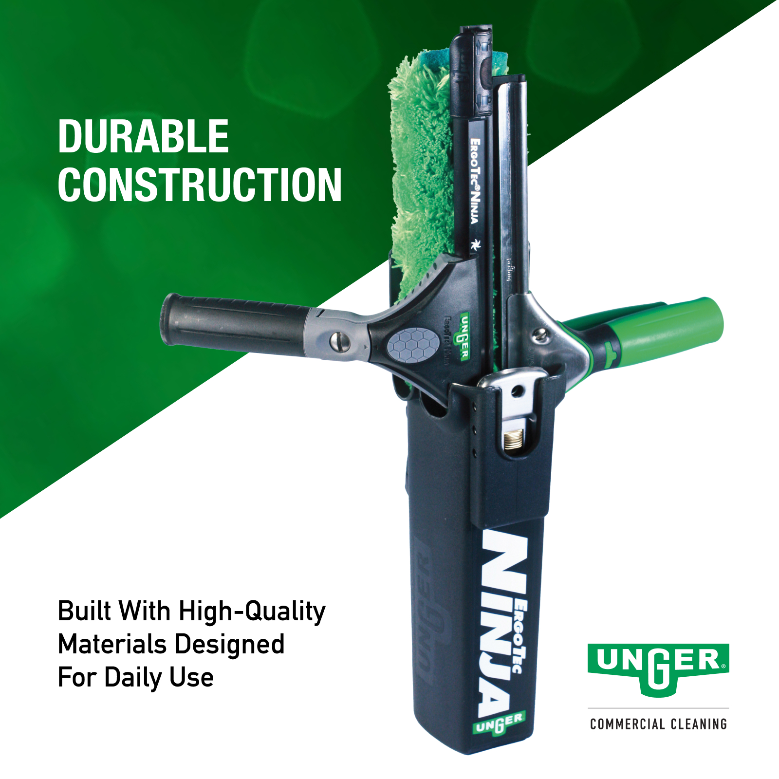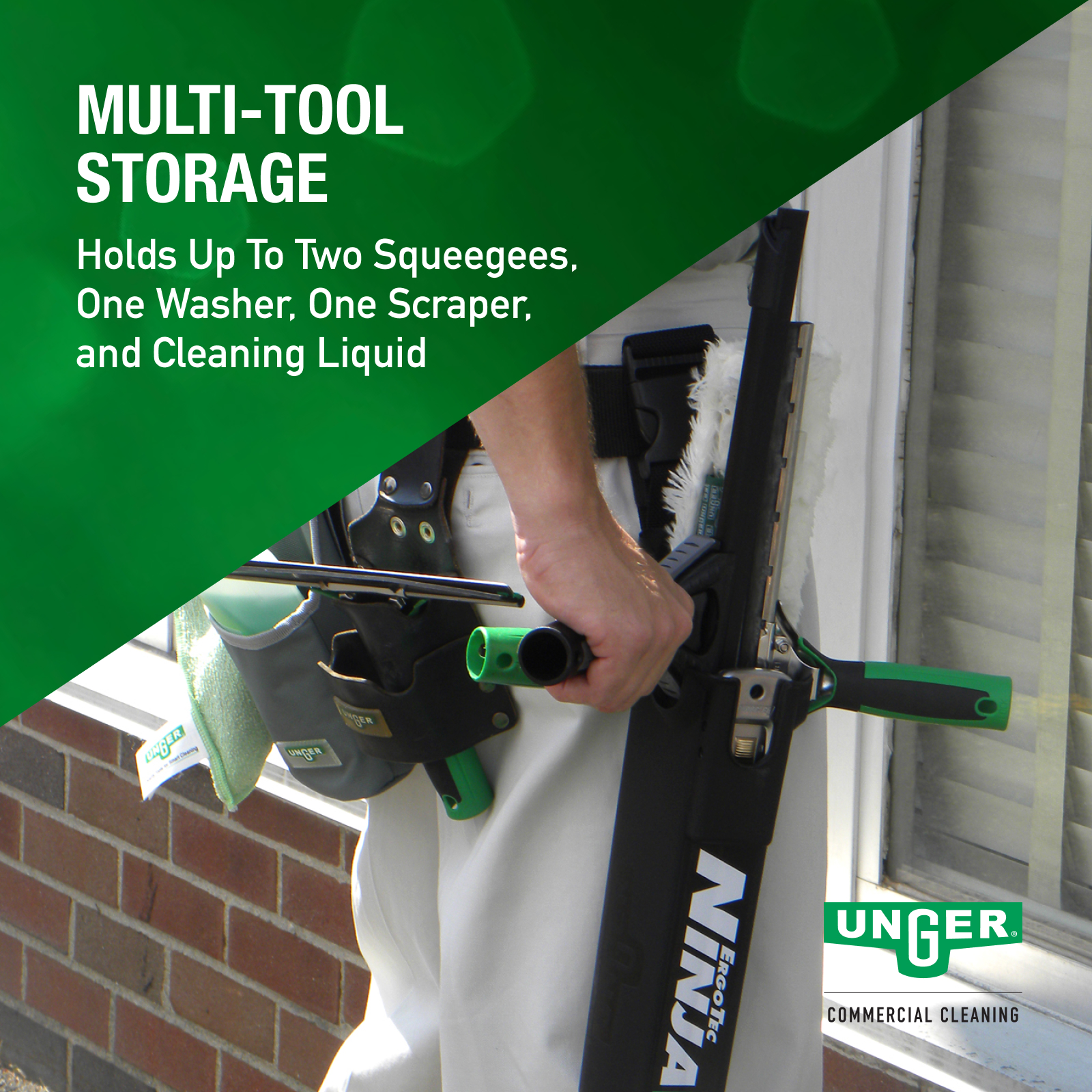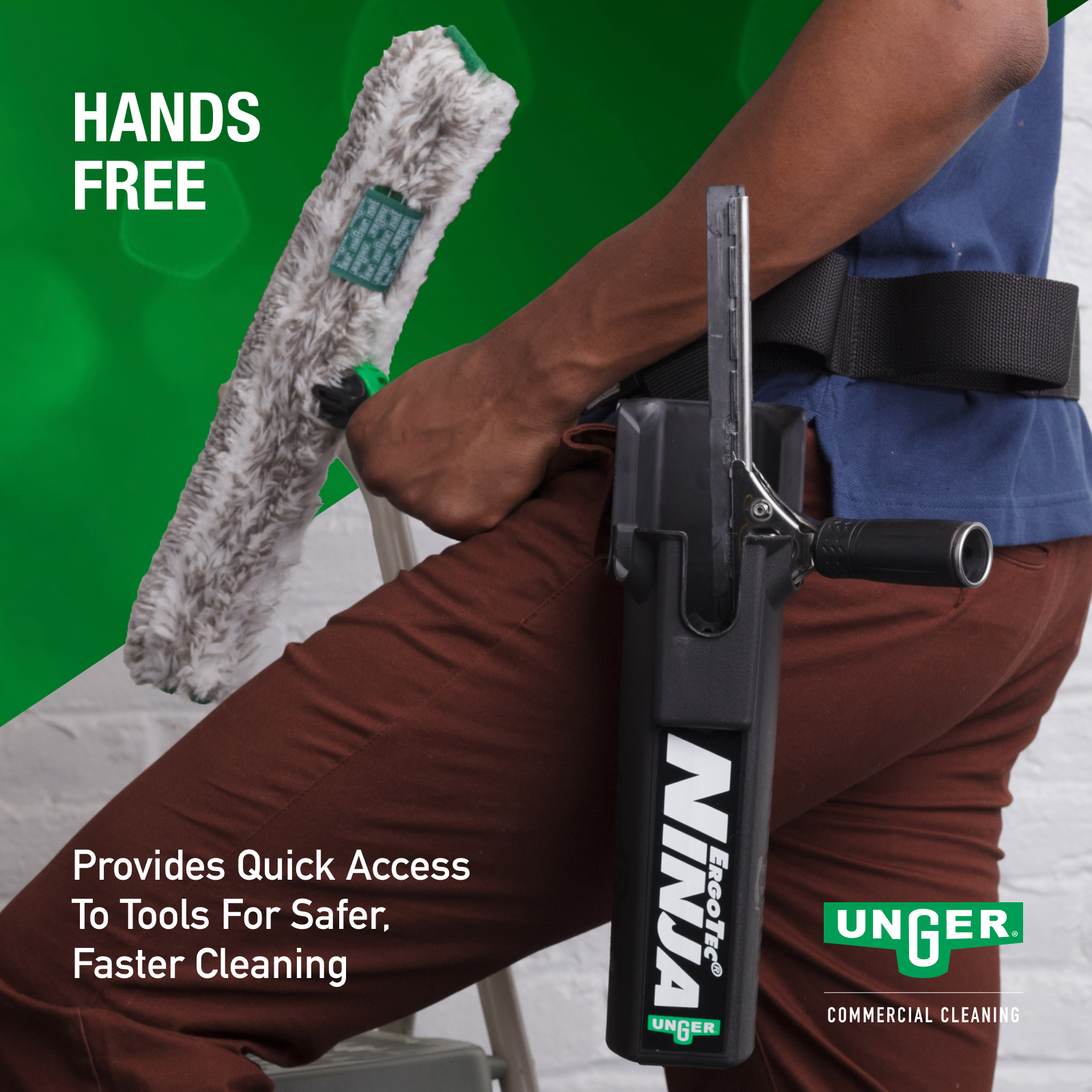 The Unger ErgoTec® Ninja Bucket On A Belt is an innovative tool holder keeps your essential cleaning tools within arm’s reach, reducing the need to climb up and down ladders and increasing overall productivity.