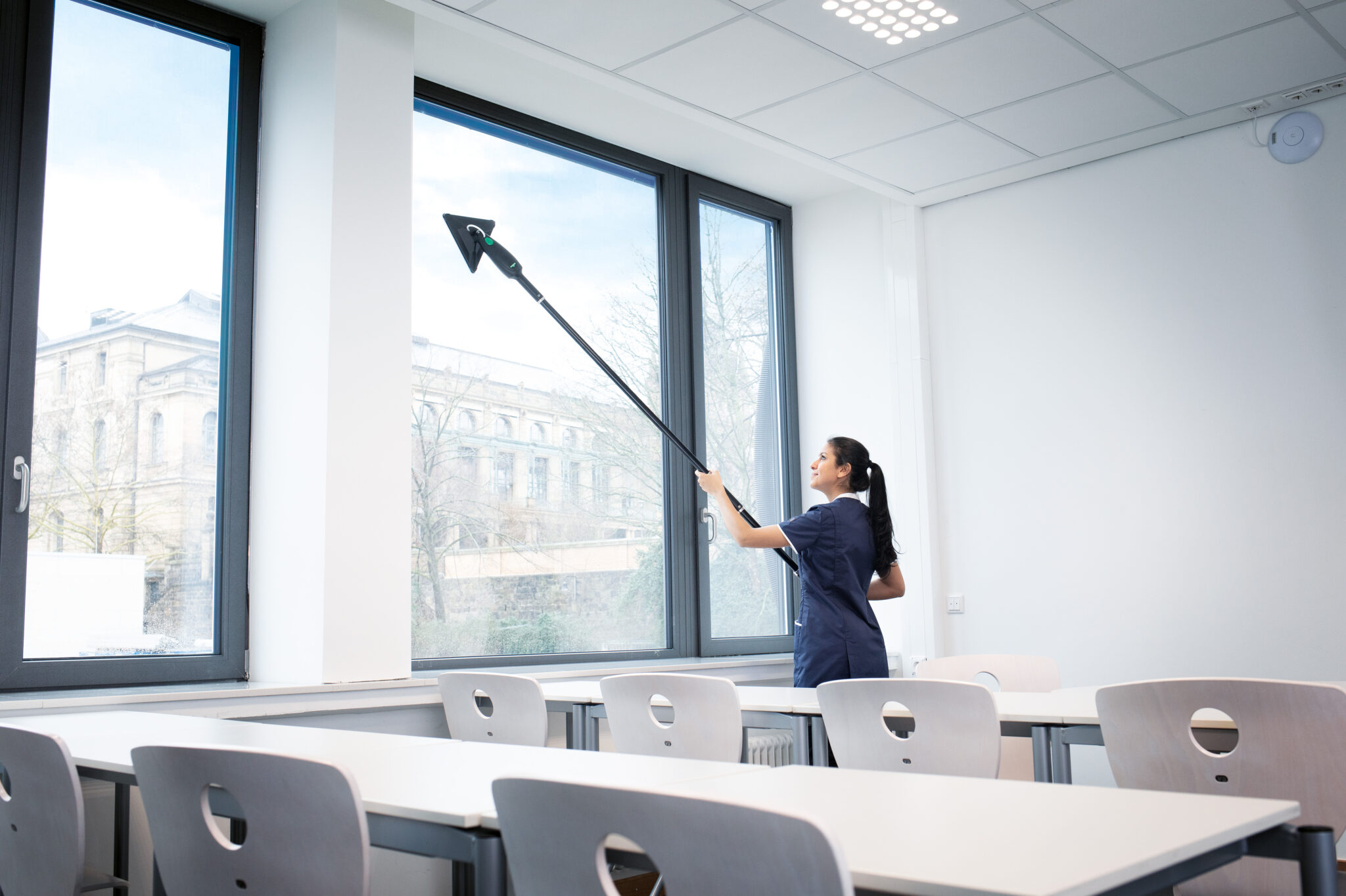 • Commercial office buildings – Clean high windows and glass partitions without interrupting the workspace.